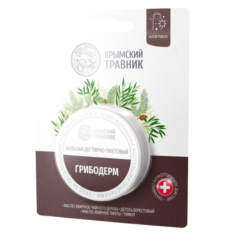 Бальзам Дегтярно-Пихтовый ГРИБОДЕРМ предназначен для эффективного ухода за проблемными участками кожи и поврежденными ногтевыми пластинами ног и рук при поражении патогенной микрофлорой (грибок).