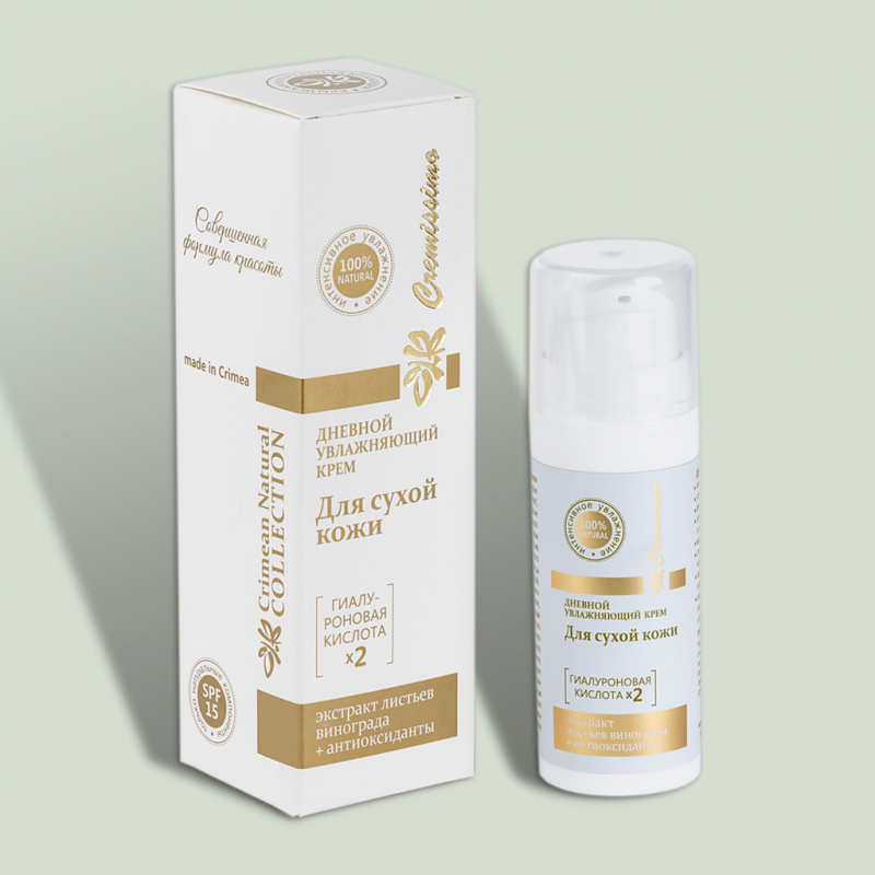 Дневной увлажняющий крем серии Cremissimo на основе гиалуроновой кислоты для сухой кожи с экстрактом листьев винограда, комплексом антиоксидантов увлажняет и регенерирует кожу, устраняет мелкие морщинки, улучшает эластичность и упругость кожи, выравнивает цвет лица, стимулирует синтез коллагена, защищает от образования свободных радикалов, обладает ангиопротекторным (капилляроукрепляющим) и противоотечным действием.
