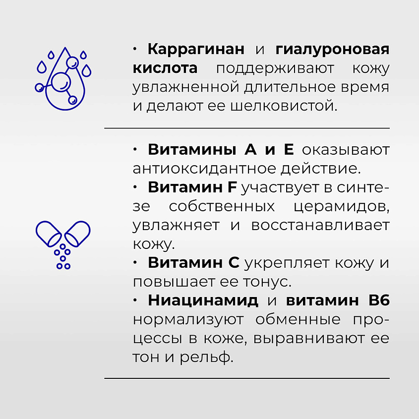 Aqua (water), pentylene glycol, glycerin, snail mucin extract, (water, urea, sodium pyrrolidone carboxylate, pentylene glycol, hydrolyzed collagen, sodium lactate, lactic acid, disodium EDTA), D-panthenol, (phenoxyethanol, ethylhexylglycerin), PEG-40 hydrogenated castor oil, disodium laureth sulfosuccinate, сarrageenan, perfume, (linoleic and linolenic acids triglycerides, isopropyl myristate, tocopheryl acetate, retinyl acetate, ionol, phenoxyethanol), niacinamide (vitamin B3), pyridoxine hydrochloride (vitamin B6), sodium ascorbyl phosphate (vitamin C), high molecular hyaluronic acid, hexyl cinnamal, limonene, linalool.