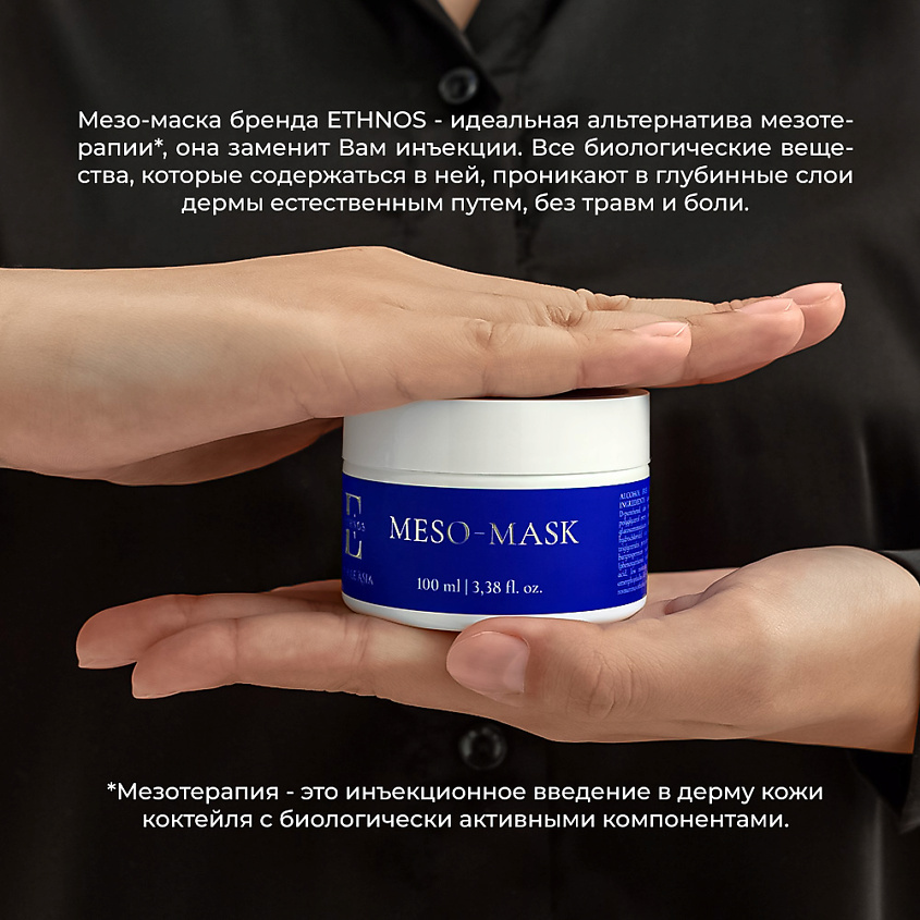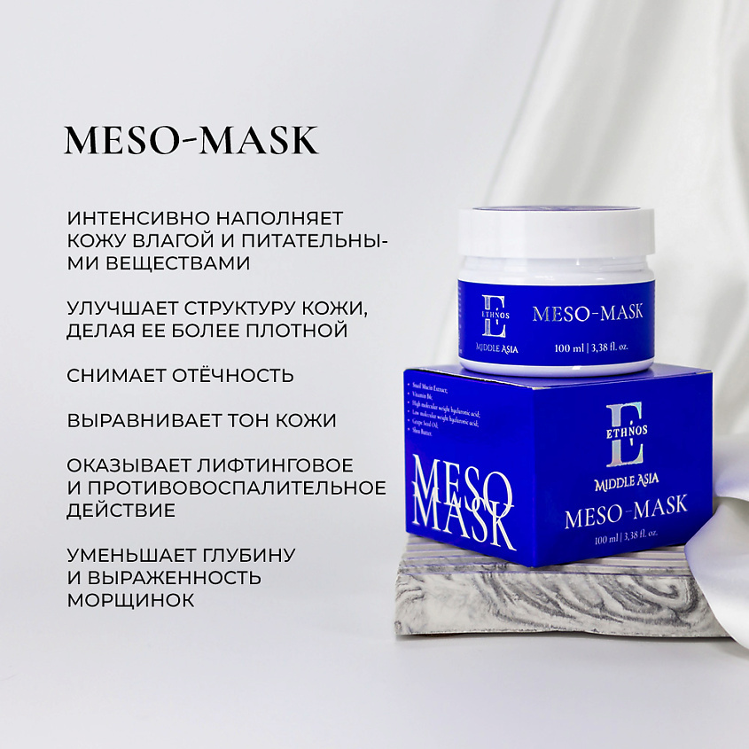 В основе всей линейки Ethnos Middle Asia лежит уникальный продукт – экстракт муцина улитки, который обладает мощным увлажняющим действием.Мезо-маска – идеальное средство ухода за кожей. Маска поможет убрать с лица следы усталости и отеки, придаст коже свежесть и сияние, напитает влагой, поможет справиться с шелушением и сухостью. Маска восстанавливает упругость кожи, делает ее эластичной, подтянутой, способствует коррекции морщин, сужает поры. Маска незаменима при нестабильном режиме дня, стрессе и усталости.