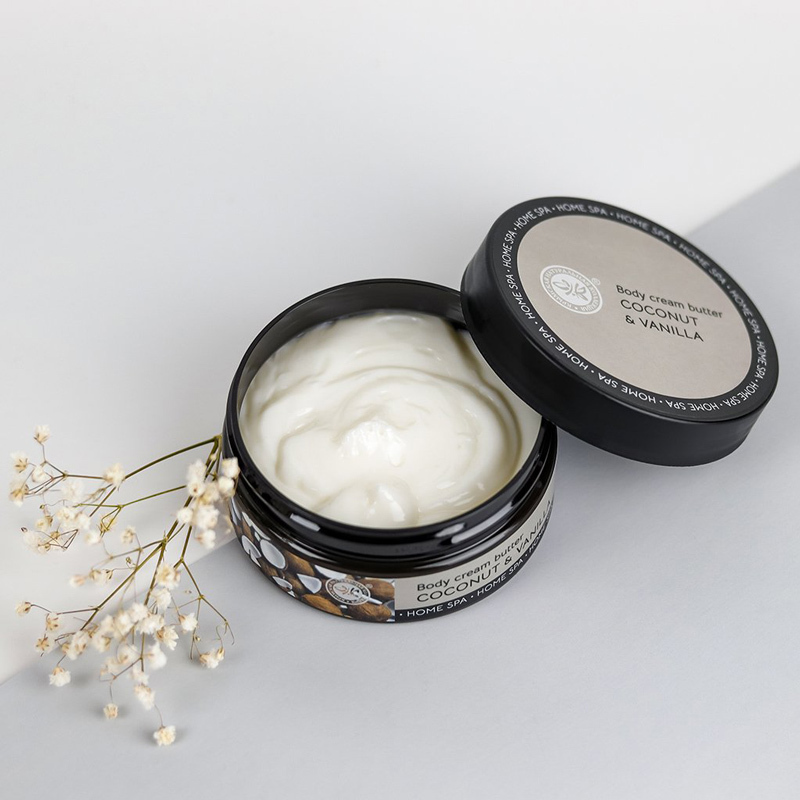 Крем-баттер для тела обеспечивает интенсивное питание, восстановление и увлажнение кожи. Благодаря активным компонентам он придает коже здоровый и ухоженный вид. Кокосовое масло обладает высокой способностью удерживать влагу в коже, делая ее мягкой, увлажненной и эластичной. Гель алоэ вера обладает способностью увлажнять кожу и восстанавливать ее естественный баланс влаги, стимулирует клеточное обновление кожи, что способствует ее более молодому, упругому и здоровому виду. Экстракт кокоса и ванили содержат антиоксиданты, которые помогают защитить кожу от вредного воздействия окружающей среды и предотвращают преждевременное старение.
