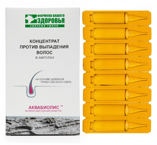 Концентрат против выпадения волос в ампулах, используют целительное действие лечебных грязей Сакского озера, пробуждает волосяные фолликулы, поддерживая здоровое состояние кожи головы. Рекомендуется для мужчин и женщин с признаками выпадения волос. Стимулирует микроциркуляцию крови и улучшает питание корней. Содержит уникальный комплекс АКВАБИОЛИС, который замедляет выпадение волос, стимулирует метаболизм клеток волосяной луковицы, оказывает защитное и восстанавливающее действие на структуру волосяного фолликула.