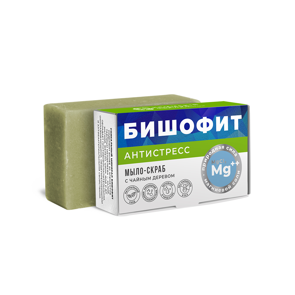 Содержит скрабирующие частички соли и бишофита, которые очищают кожу, улучшают микроциркуляцию. Благодаря эфирному маслу чайного дерева в составе подходит для жирной и проблемной кожи. Мыло-скраб снижает жирность кожи, улучшает ее эластичность.