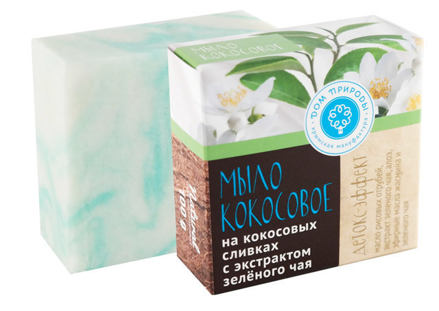 Состав: омыленные растительные масла (масло кокосовое, масло оливковое, масло касторовое), воск пчелиный, кислота олеиновая, масло рисовых отрубей, кокосовые сливки, витамин Е, экстракты зеленого чая и алоэ, эфирное масло жасмина, хлорофиллин.
