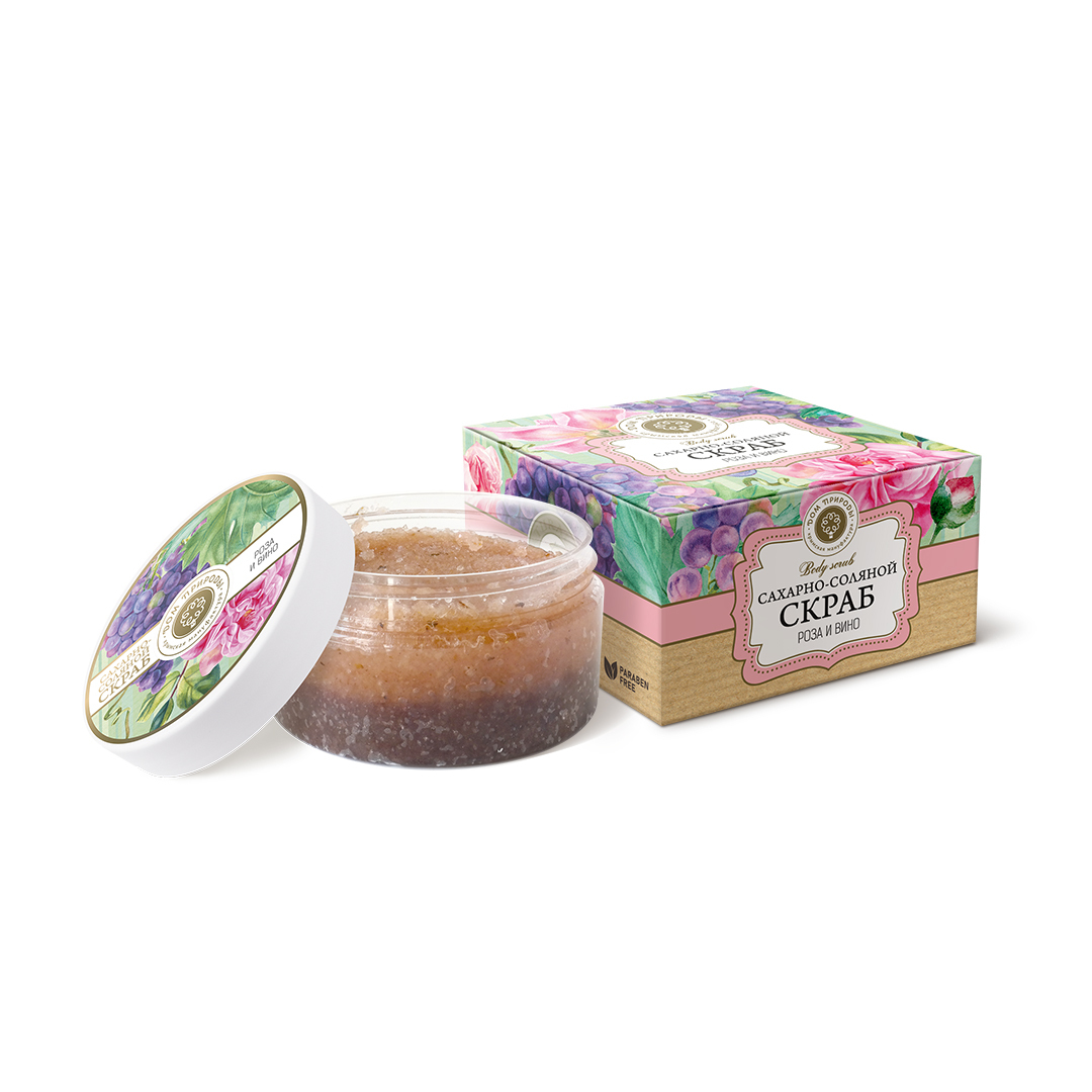 Экстракт розы бережно ухаживает за самой тонкой и чувствительной кожей, поддерживает увядающую кожу. Экстракт винограда - сильный антиоксидант, замедляет старение кожи, делает ее эластичной, прекрасно тонизирует и увлажняет кожу. Янтарная кислота оказывает омолаживающее воздействие на кожу, восстанавливает ее на клеточном уровне. Кристаллики сахара и соли в сочетании с маслами оливок, виноградных косточек и жожоба бережно очистят кожу от загрязнений и отмерших клеток, сделают ее мягкой, нежной и шелковистой. После скраба не требуется применение дополнительных средств для увлажнения кожи.