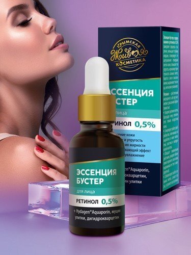 Эссенция-бустер с содержанием ретинола 0.5% замедляет процессы старения, уменьшает глубину морщин, стимулирует отшелушивание отмерших клеток кожи, повышает ее упругость, нормализует деятельность сальных желез, борется с акне и высыпаниями, выравнивает тон лица, интенсивно увлажняет.